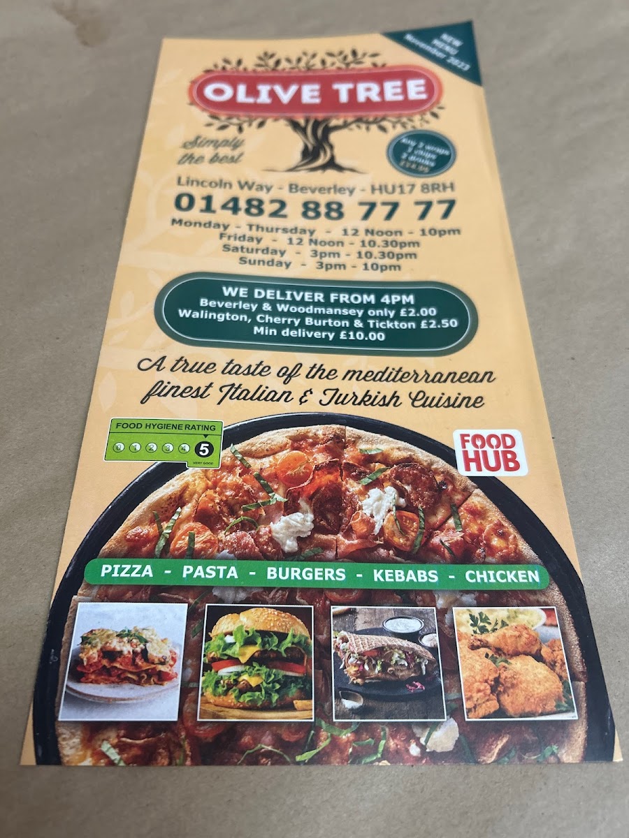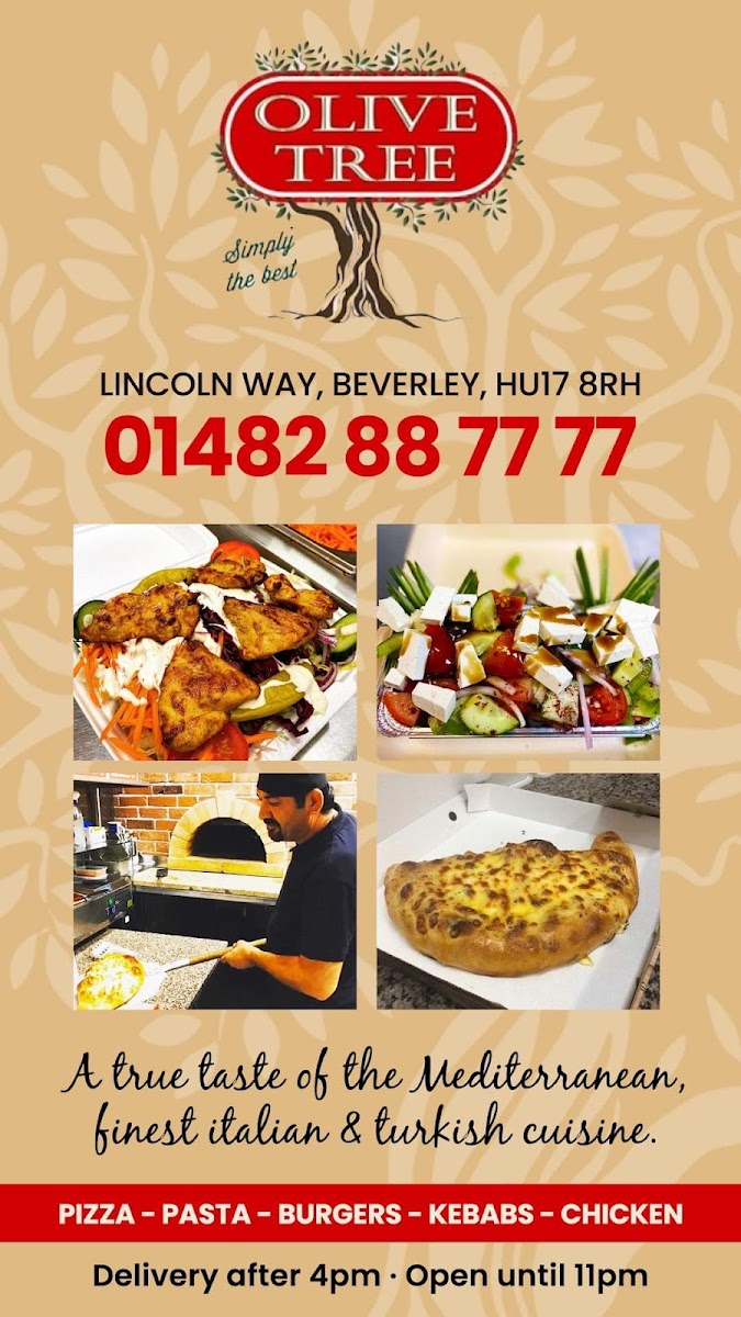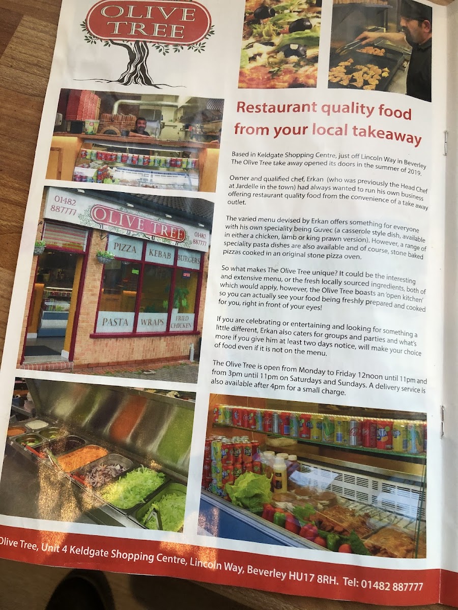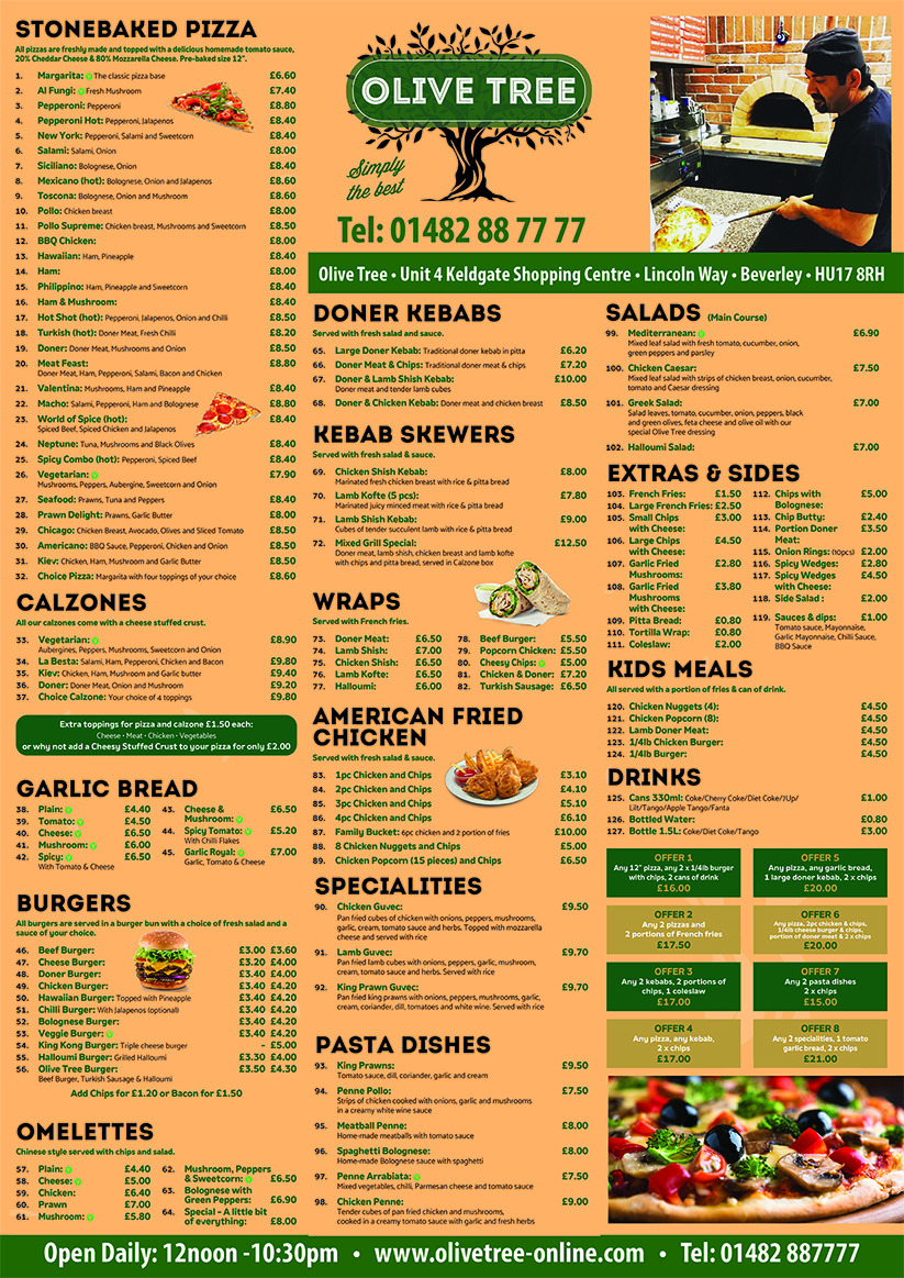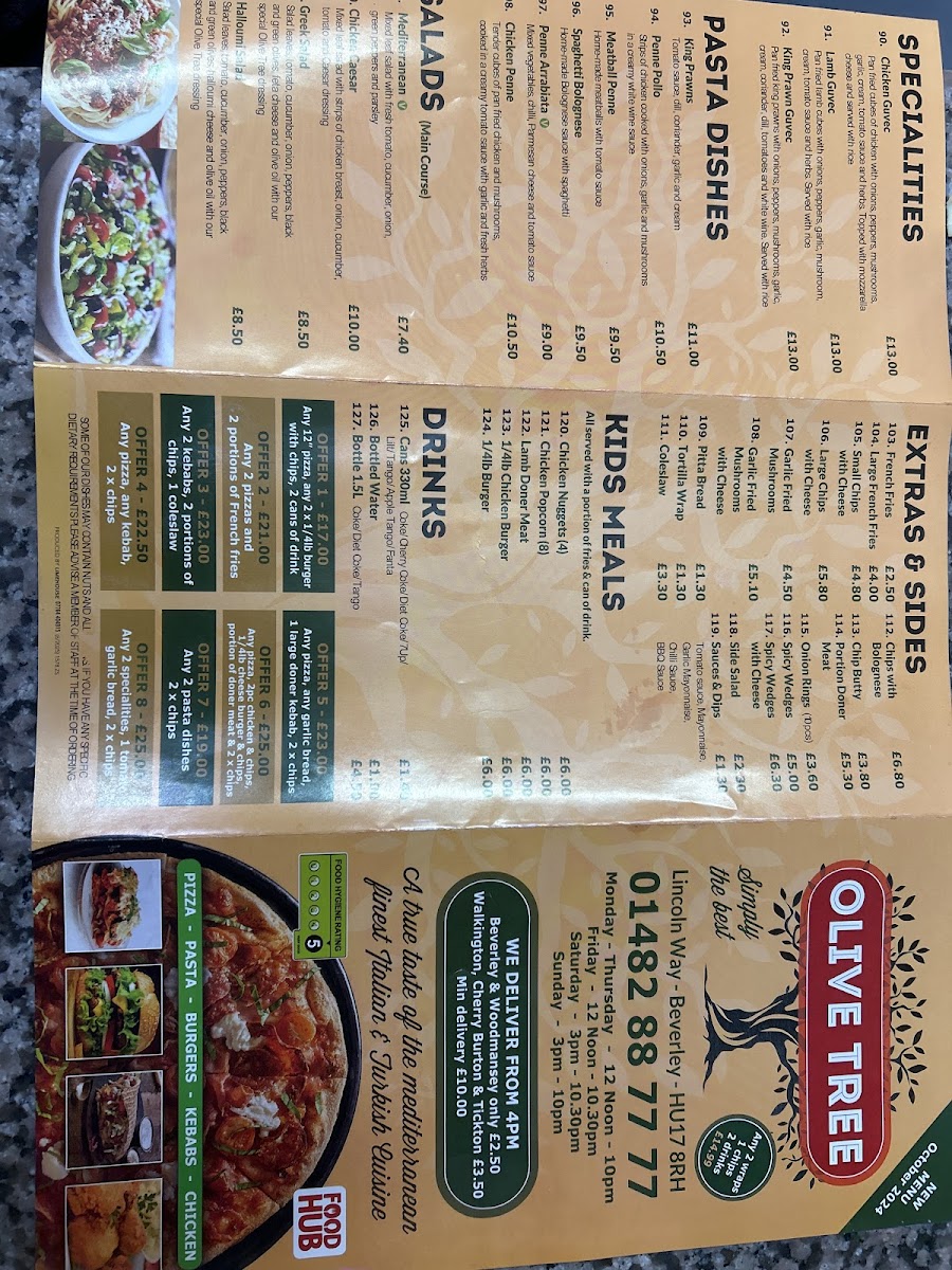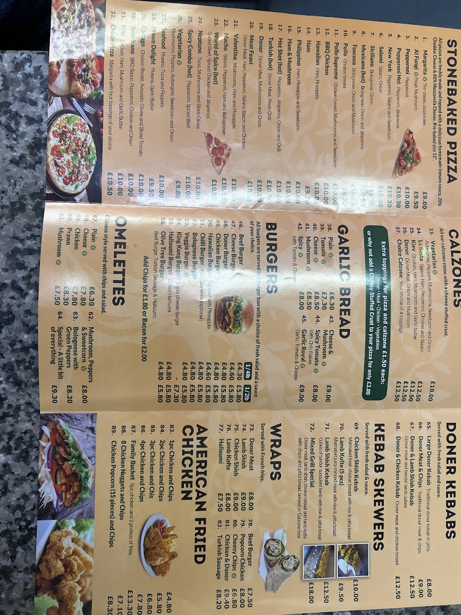 Overall, Olive Tree Takeaway in Beverley offers a broad and satisfying menu that covers everything from classic comfort foods to more flavorful specialties. The stonebaked pizza selection, including Margarita, Al Fungi, and Pepperoni Hot, provides familiar favorites, while options like calzones such as Vegetarian and Kiev Doner add variety. The menu continues with indulgent choices like Garlic Bread with Cheese and hearty Burgers including the Cheese Burger and Hawaiian Burger. For something more substantial, the Doner Kebab, Doner Meat & Chips, and skewered dishes like Chicken Shish Kebab and Lamb Kofte (5 pcs) stand out. There’s also a good mix of lighter or alternative options, including wraps like Halloumi Wrap, pasta dishes such as Spaghetti Bolognese and Penne Arrabiata, and fresh salads like the Greek Salad and Chicken Caesar. The menu is rounded off with comforting extras like French Fries, family-friendly Kids Meals such as Chicken Nuggets (4), and a full range of drinks including Cans 330ml Coke and Bottle 1.5L Coke. While prices aren’t listed, the variety and balance of dishes suggest a menu designed to cater to different tastes and appetites, making it a reliable choice for a casual takeaway.
